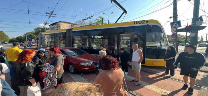 Impact violent la Timișoara. Tramvai izbit de mașină, șofer luat cu salvarea. VIDEO