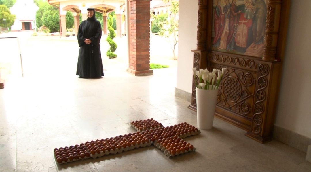 Potrivit obiceiului din partea locului, maicutele aseaza apoi ouale in forma de cruce, de data aceasta intr-un pridvor din curtea manastirii, pentru sfintire. Langa cruce ele pun o icoana si flori proaspete. Maicile sunt incredintate ca asta le va aduce pace si bunastare.