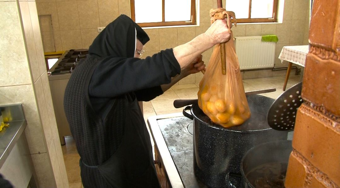 Maicutele de la Manastirea Sag Timiseni s-au apucat de treaba dis de dimineata, imediat dupa slujba. Au batut toaca si au anuntat ca incepe vopsirea oualor cu coji de ceapa. Au adus cosurile cu oua proaspete din cuibarul manastirii si le-au pun la fiert. Bucataria a devenit neincapatoare pentru ca nici una nu a stat deoparte. In cateva ore, ele au reusit sa vopseasca nu mai putin de 1.000 de oua.