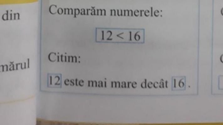 La pagina 25 a manualului de Matematica si explorarea mediului, publicat la Editura Didactica si Pedagogica apare un exemplu de comparare intre numere. Insa, desi din punct de vedere grafic informatia este prezentata corect, 12<16, concluzia este scrisa gresit:„Citim 12 este mai mare decat 16”.