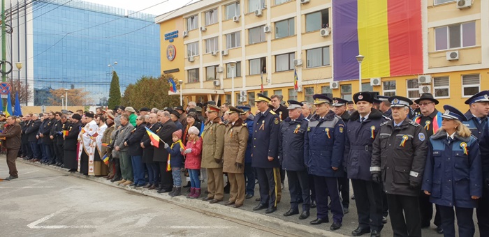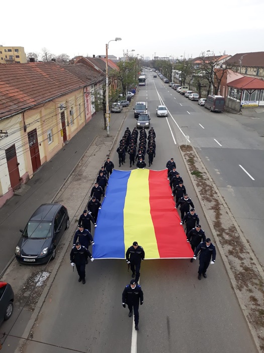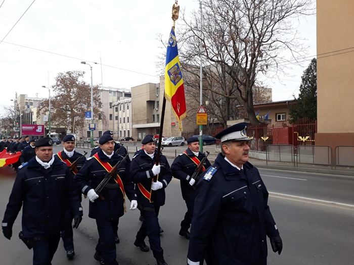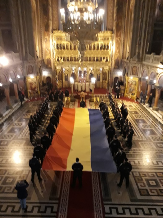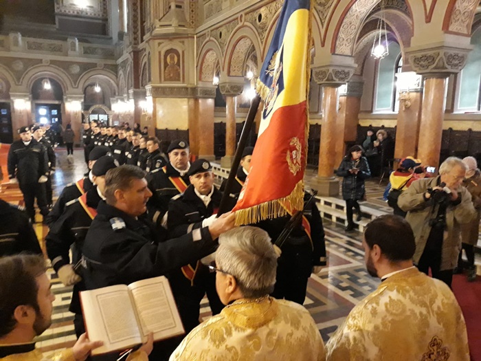 Inainte de ceremonie, 70 de jandarmi au purtat un drapel de 14 metri lungime pe 4 latime, in Catedrala Mitropolitana din Timisoara, unde a fost sfintit.