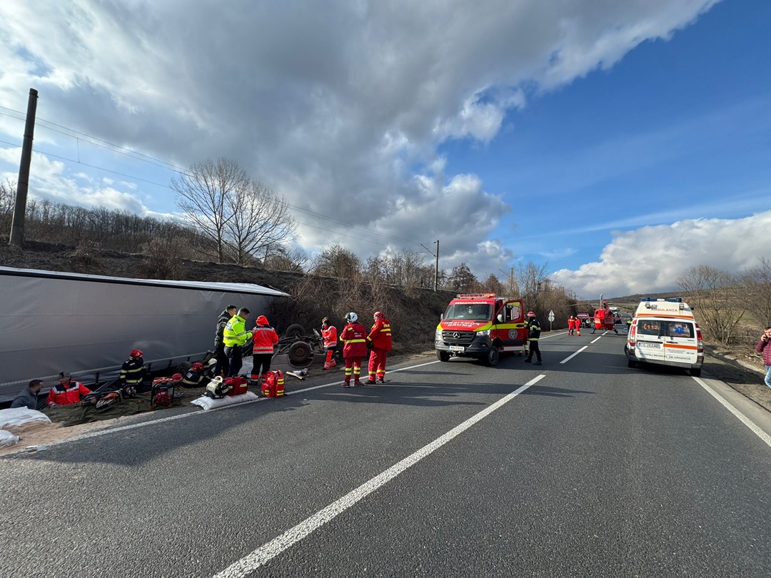 Șoferul autocamionului a primit îngrijiri medicale la fața locului și a fost transportat la spital de către echipajul Serviciului Județean de Ambulanță“, transmit reprezentantii ISU Caras-Severin.