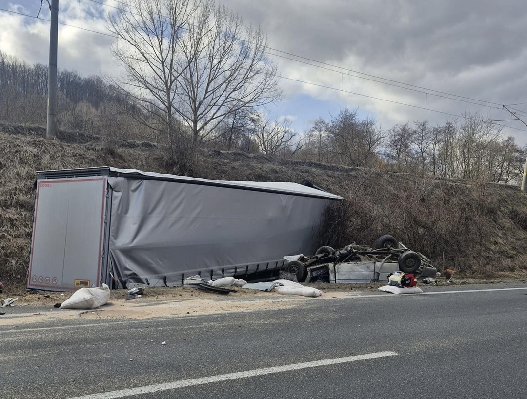 Conducătorul unui autocamion ar fi pătruns pe sensul opus de mers și a intrat în coliziune frontală cu o autoutilitară.