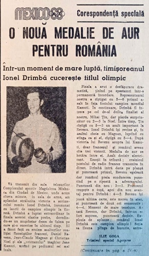 TIMISOARA. In 1968, Timisoara nu avea echipa in prima liga de fotbal, dadea campioana Romaniei la handbal feminin, avea o reprezentanta si in liga baietilor, iar in rugby nu emitea inca pretentii. Totusi, cea mai importanta performanta a anului avea sa vina de la mii de kilometri distanta, din Ciudad de Mexico.