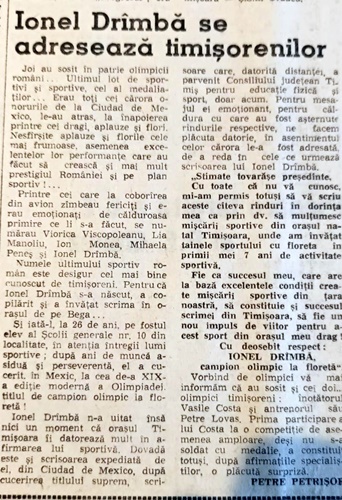 “Stimate tovarase presedinte Cu toate ca nu va cunosc, mi-am permis totusi sa va scriu aceste randuri in dorinta mea ca prin dumneavoastra sa multumesc miscarii sportive din orasul natal Timisoara, unde am invatat tainele sportului cu floreta in primii mei 7 ani de activitate sportiva. Fie ca succesul meu, care are la baza excelentele conditii create miscarii sportive din tara noastra, sa constituie si succesul scrimei din Timisoara, sa fie un nou impuls de viitor pentru acest sport in orasul meu drag. Cu deosebit respect: Ionel Drimba, campion olimpic la floreta“, scria timisoreanul intr-o scrisoare adresata presedintelui Consiliului Judetean Timis, dupa incheierea Jocurilor Olimpice din Mexic, si aparuta in “Drapelul Rosu”.