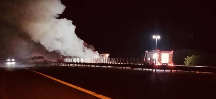 TIMIS. Un tir care transporta granule de PVC si polistiren a ars ca o torta, noaptea trecuta, pe Autostrada A1, la Traian Vuia, in Timis. In urma incendiului, se circula cu restrictii momentan.
