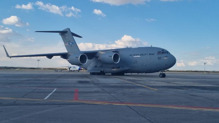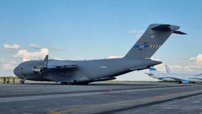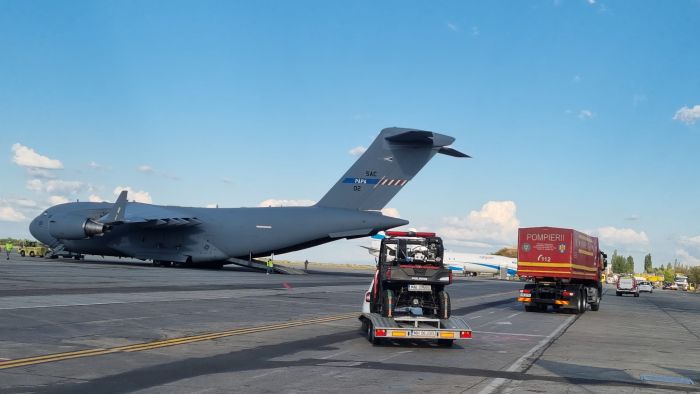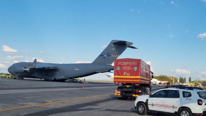 TIMISOARA. Pe Aeroportul International ”Traian Vuia” din Timisoara a aterizat avionul militar de tip C17 care va transporta pompierii si echipamentele lor, in Franta, pentru a ajuta la stingerea incendiilor de vegetatie.