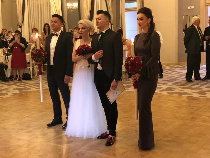 “Ni ne-a spus ca mirii s-au certat si trebuie sa intram sa animam atmosfera pentru ca invitatii sa nu observe. Am intrat, i-am pus microfon, si cand a trecut in fata salii am trecut eu la surpriza: i-am cerut mana. Apoi a aparut perechea de nasi. Dupa nasi am facut sa apara toate neamurile ei, toti au aparut fara ca ea sa isi dea seama. Apoi i-am adus aminte de povestile cu rochiile de mireasa. Ea a spus ca, daca ar face o nunta cu mine, s-ar imbraca in rochie neagra de mireasa, apoi i-am adus aminte de detaliul de la Bucuresti si a treia rochie, care era e una care i-a placut ei foarte mult: ivory. Apoi au intrat in scena restul detaliilor, pantofii, bijuteriile“, a mai spus Lorenzo pentru opiniatimisoarei.ro.