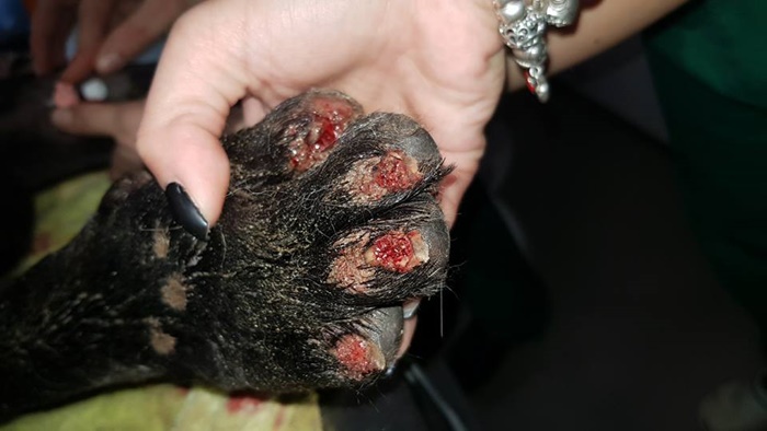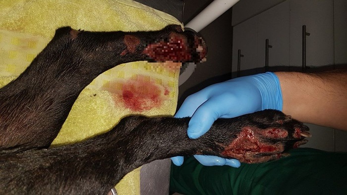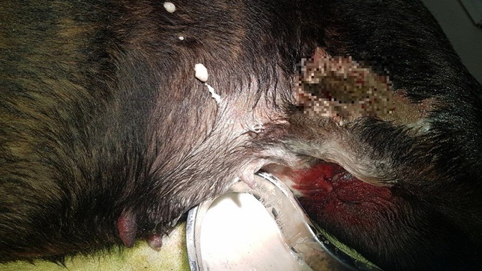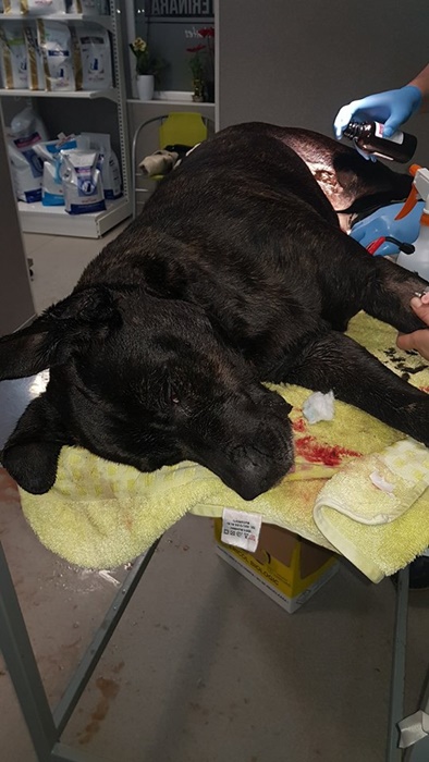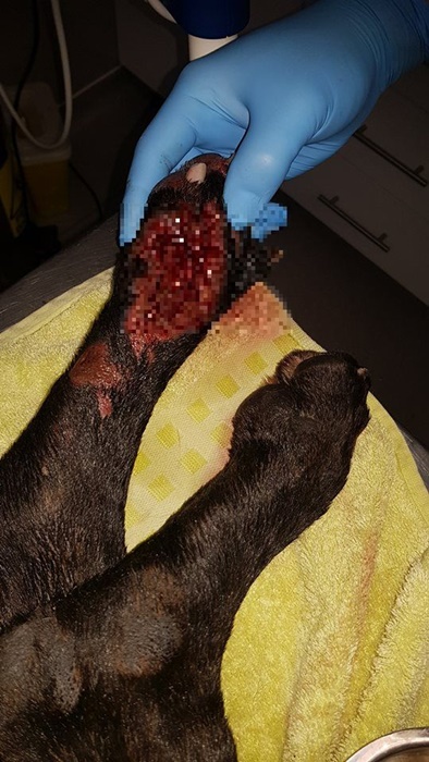 Se intampla in comuna Giroc, de langa Timisoara, iar cainele a fost descoperit de niste tineri inimosi. Acestia au luat animalul ranit si l-au dus la veterinar. Medicul s-a ingrozit si el cand l-a vazut, iar ranile aratau ca fusese maltratat.