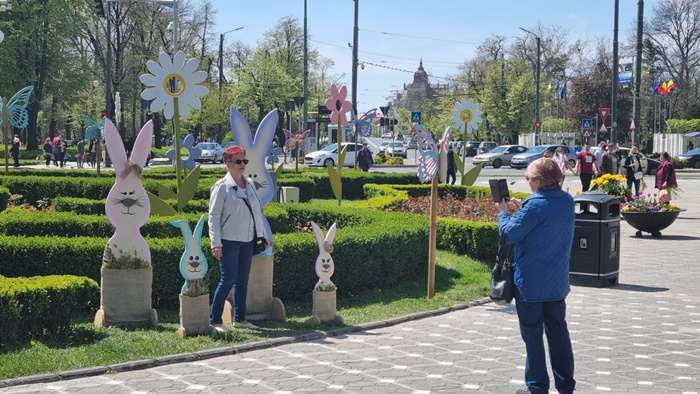 Pe spatiile verzi din Piata Victoriei si din Unirii au fost instalate figurine cu oua, flori, fluturi si iepurasi.