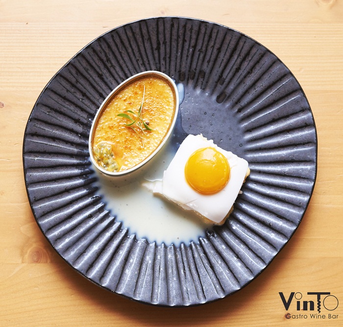 5. Desert – Ou – Crocque Madame in care oul a fost o pannacotta de cocos cu galbenus lichid de mango, crema de cheesecake cu vanile si pandispan plus un creme brulee aromatizat cu yuzu