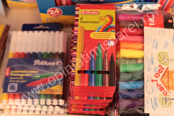 Spre exemplu, marca Faber-Castell: acuarele 12 culori – 10 lei, ascutitoare tripla – 12 lei, creioane colorate – 25 de lei, carioca 10 culori – 12.4 lei, plastilina – 11 lei.