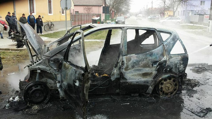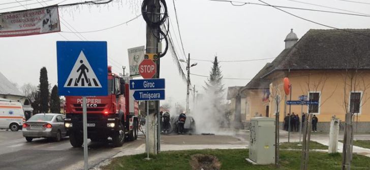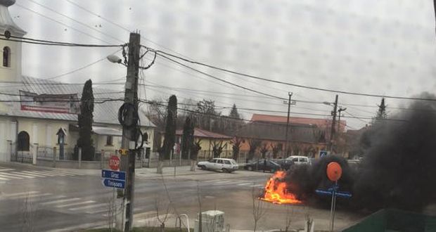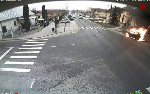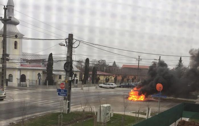 TIMISOARA. Momente de panica, duminica dimineata, pe o strada principala din localitatea Chisoda aflata la marginea Timisoarei! O masina a ars ca o torta in mijlocul unei intersectii.
