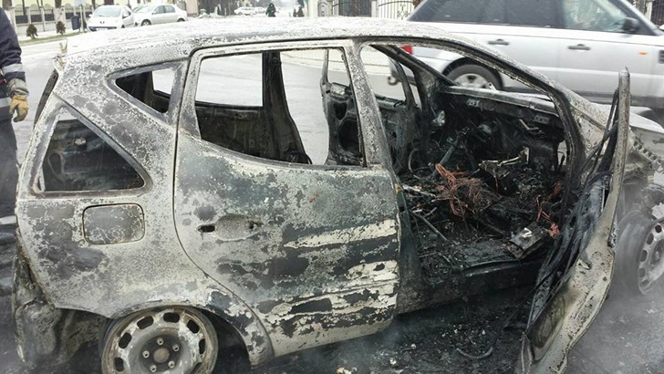 Soferul e fericit ca a scapat cu viata. Masina insa s-a facut scrum.