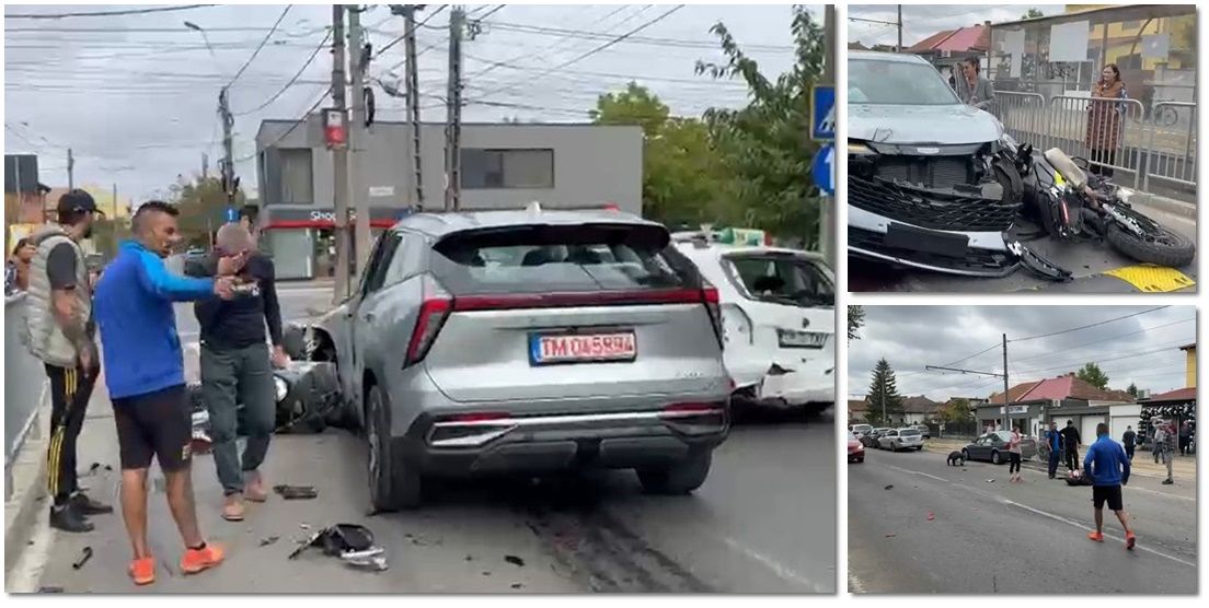 TIMIȘOARA. Grav accident la Timișoara, pe strada Drubeta, colt cu Musicescu. O femeie, aflată la volanul unei mașini, a spulberat un motociclist și o mașină de taxi care se aflau în trafic, în fața sa.