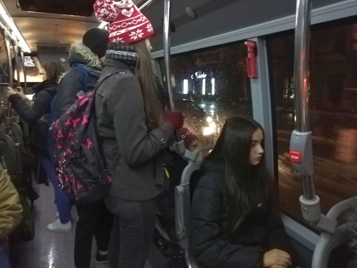 Daca in prima masina la statia de la Pod s-au urcat doar cei sase copii, la statia de la Monumentul Eroilor minibuzul s-a umplut ochi si a fost nevoie si de cel de-al doilea mijloc de transport. Prima statie la care au coborat elevii a fost cea de la Colegiul National Banatean.