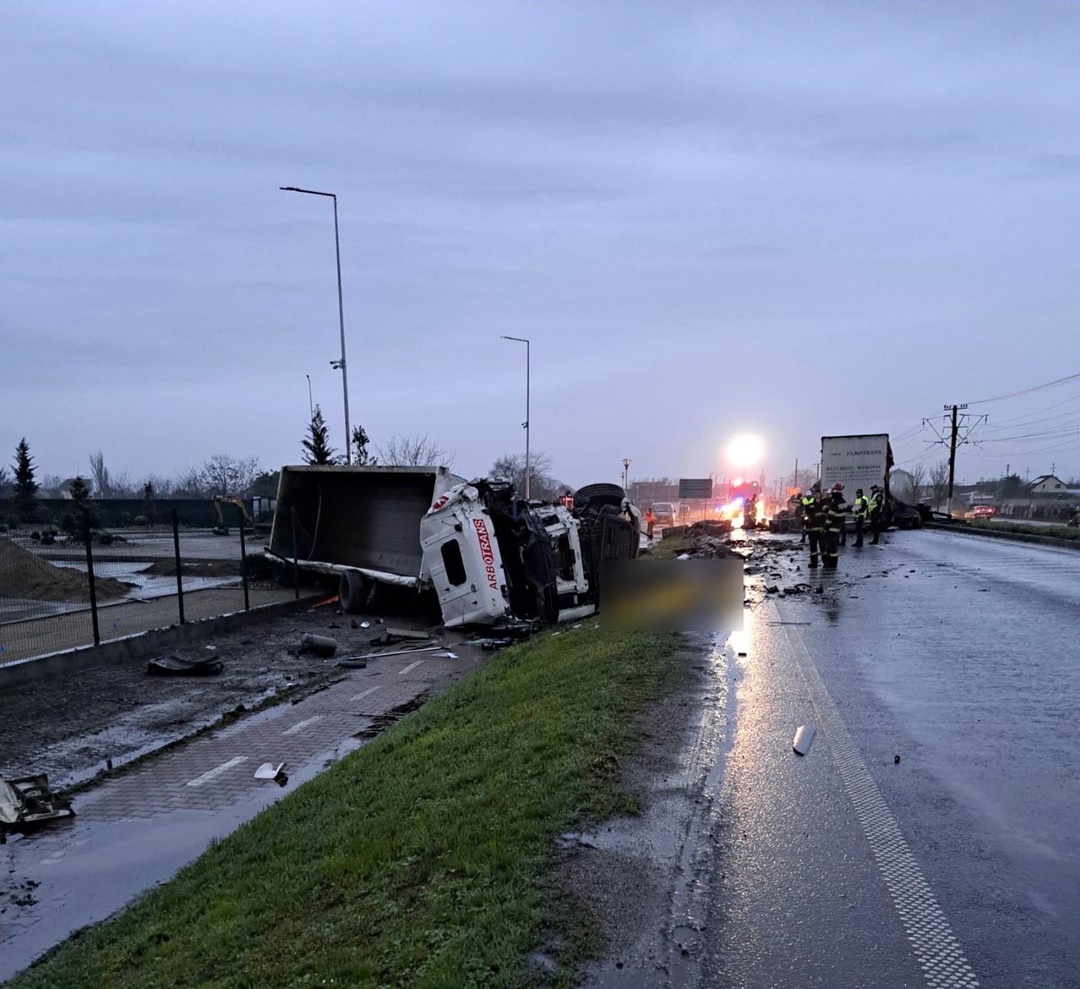 Grav accident de circulație, joi dimineață, pe DN7, în apropiere de Arad. Un autotren care transporta mașini de spălat și o autobasculantă încărcată cu nisip s-au ciocnit violent.