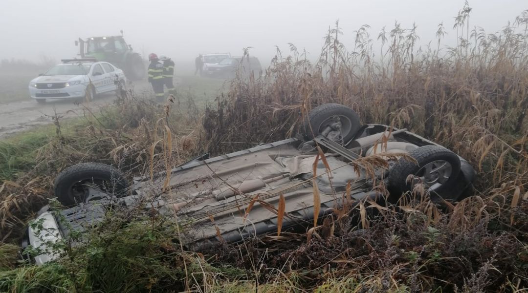 Intre localitatile Turdas si Pricaz, soferul a pierdut directia, in conditiile in care soseaua era umeda, iar autoturismul scapat de sub control a derapat si s-a dat peste cap, oprindu-se pe plafon in vegetatie.