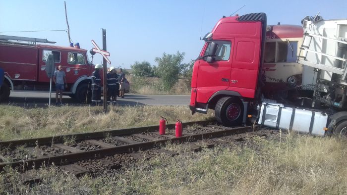Totul s-a petrecut la trecerea la nivel cu calea ferata din comuna Pesac. Soferul autocamionului de transport cereale s-a avantat pe sinele de tren fara sa se opreasca si sa se asigure mai intai, asa cum cerea indicatorul Crucea Sfantului Andrei.
