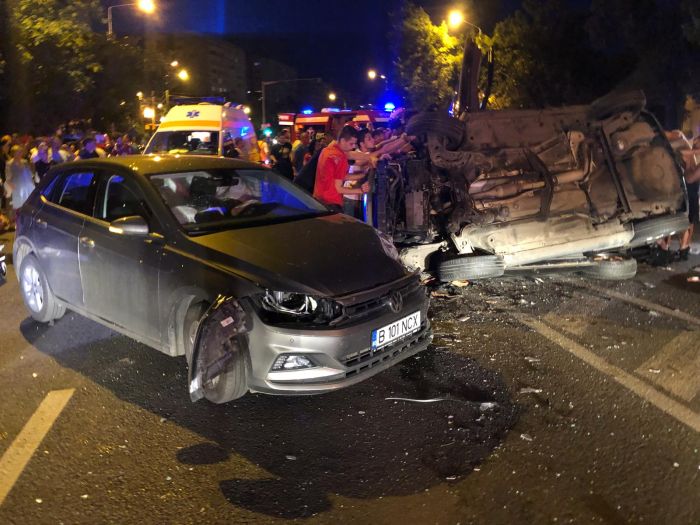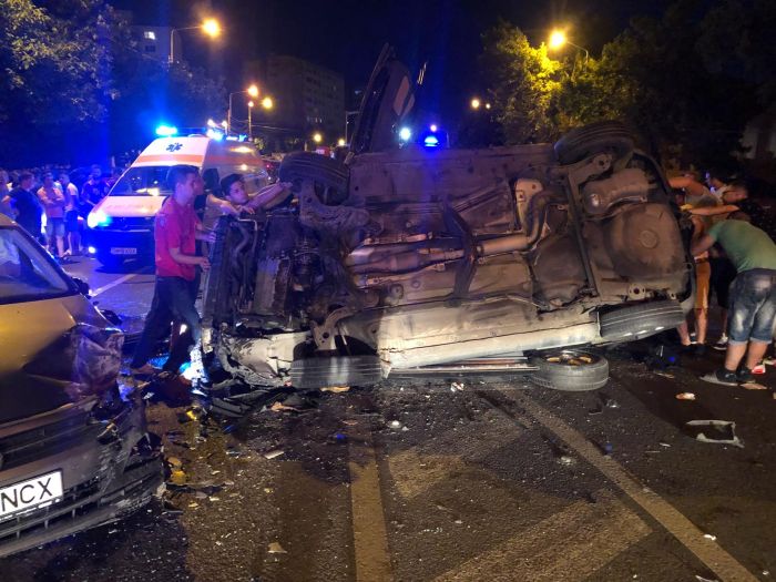 O masina a ajuns cu rotile in sus, dupa ce s-a izbit de o alta, pe Calea Sagului, in apropiere de Sectia 3 de Politie. Doi tineri au fost raniti.