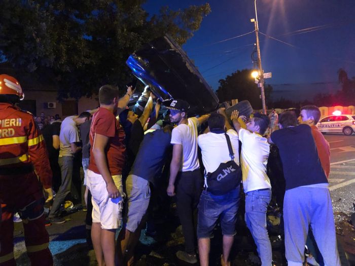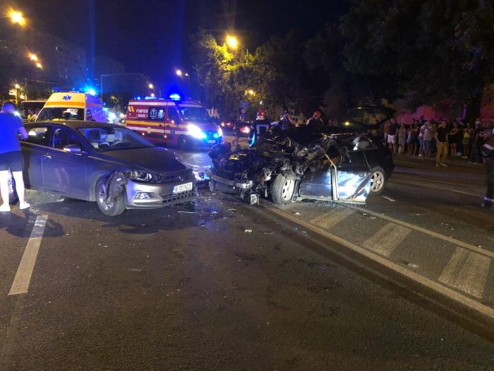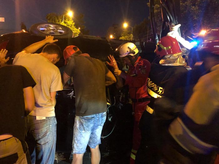 Unul dintre cei doi soferi implicati in accident si o tanara pasagera au fost raniti, iar conducatorul auto a ramas incarcerat. Pompierii au intervenit rapid pentru recuperarea lui, iar in ajutor le-au sarit trecatorii de pe strada ori alti soferi care s-au nimerit in zona accidentului.