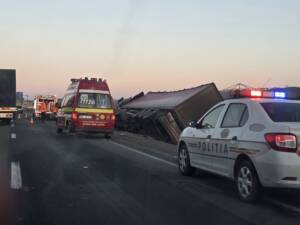 În urma impactului, tirul s-a răsturnat, iar conducătorul auto a rămas încarcerat în cabină.