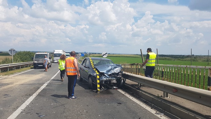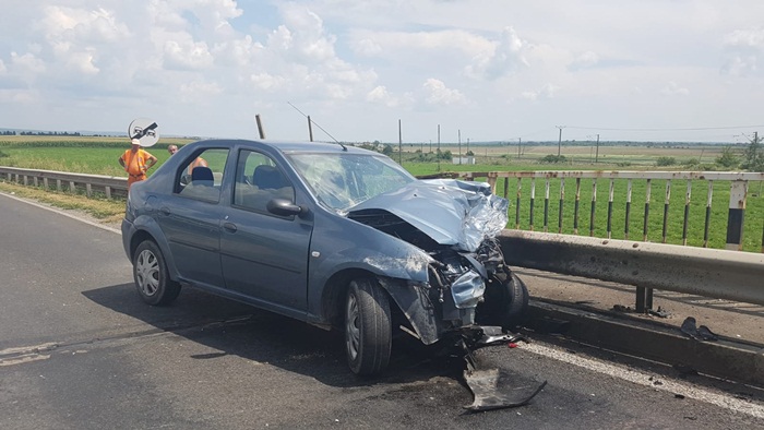 O autoutilitara a Ambulantei Timis si o Dacia Logan s-au izbit violent pe podul de la Remetea Mare, peste calea ferata, inainte de urcarea pe autostrada. Soferul masinii a lovit mai intai parapetele soselei si a ricosat in Salvare.