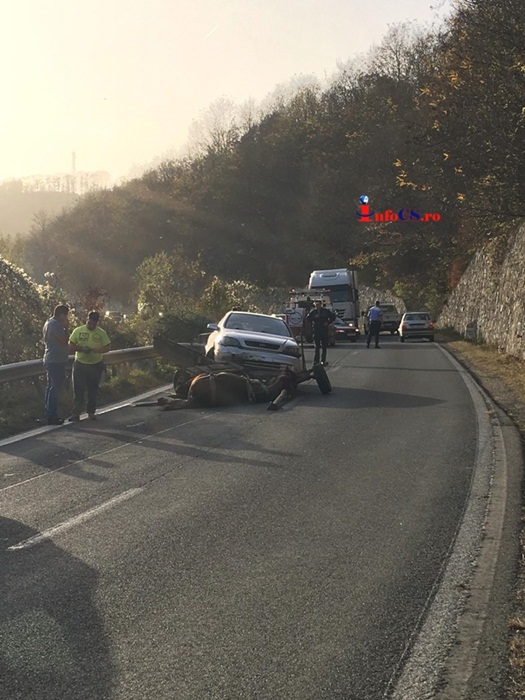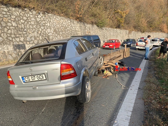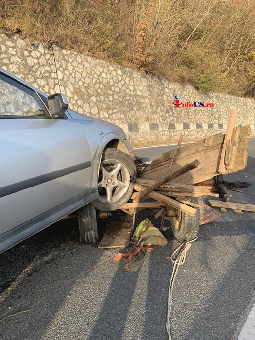 Accidentul a avut loc la iesirea din Bocsa catre Resita. Soferul unui Opel a luat o curba cu viteza si i-a aparut in fata o caruta. Omul nu a reusit sa evite impactul si a zdrobit atelajul.