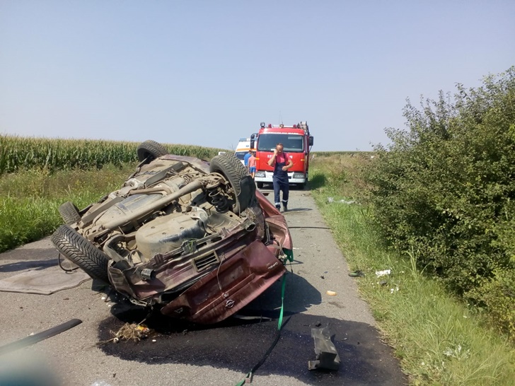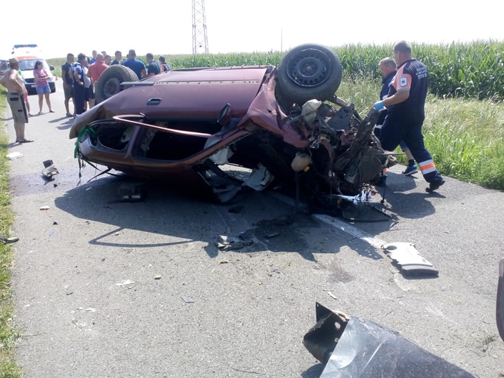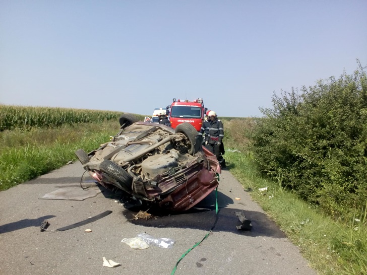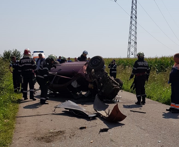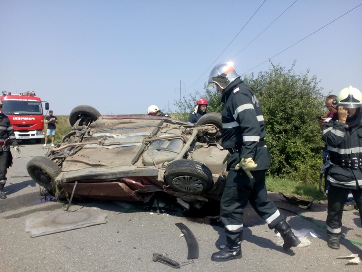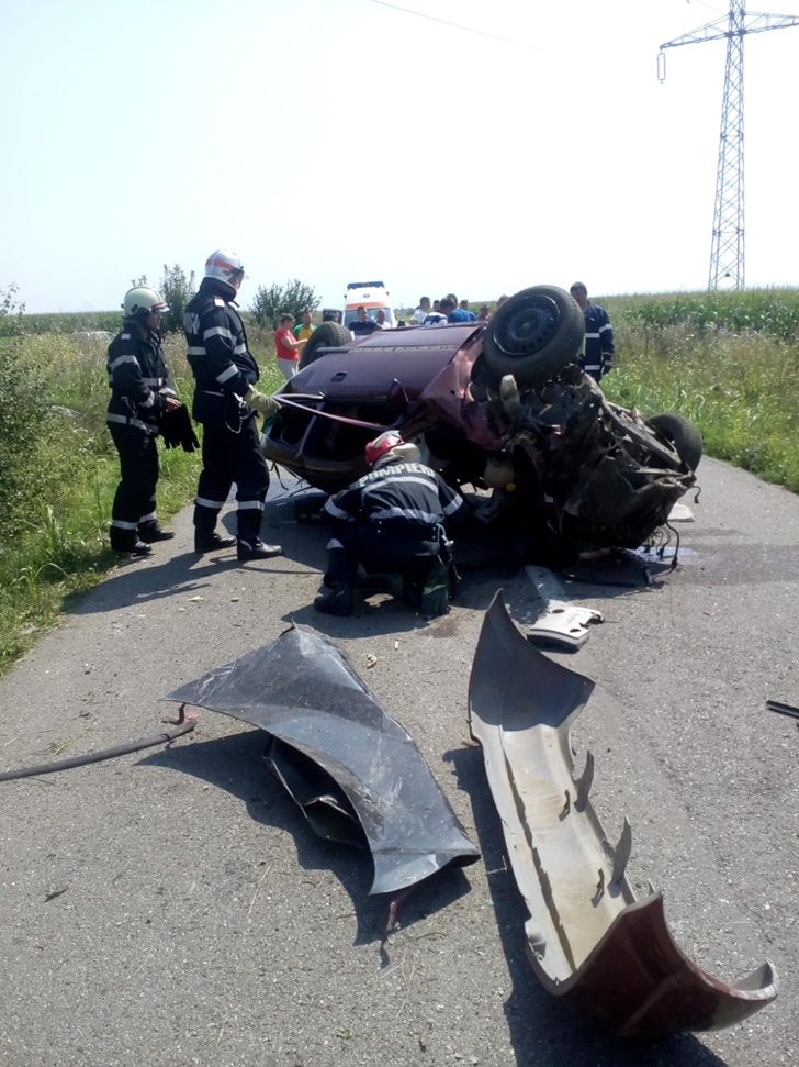 Impactul a fost atat de puternic incat autoturismul s-a rasturnat de mai multe ori, oprindu-se in mijlocul soselei.