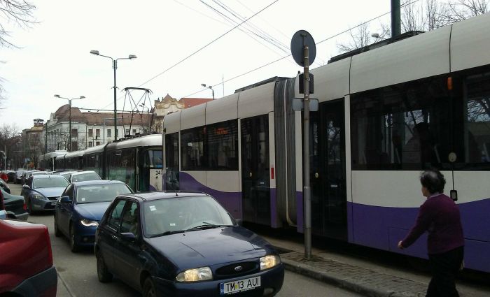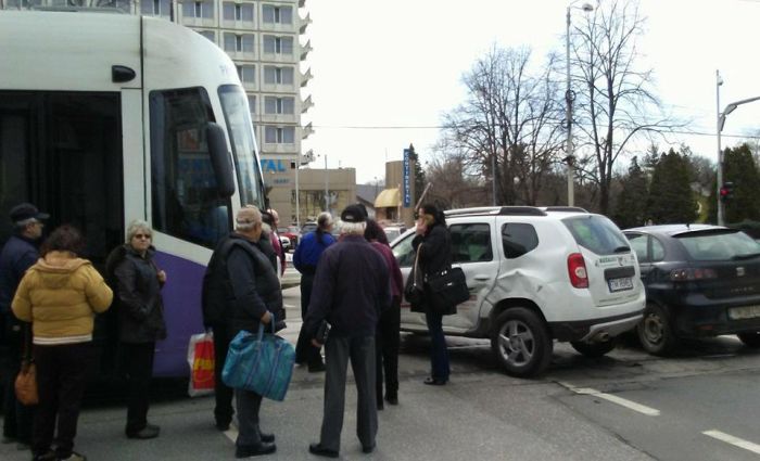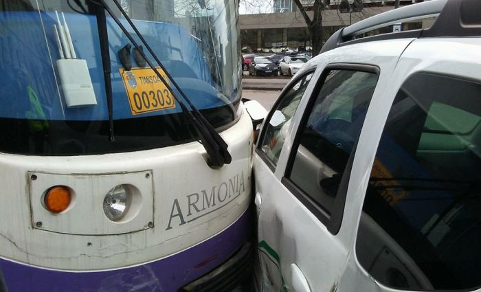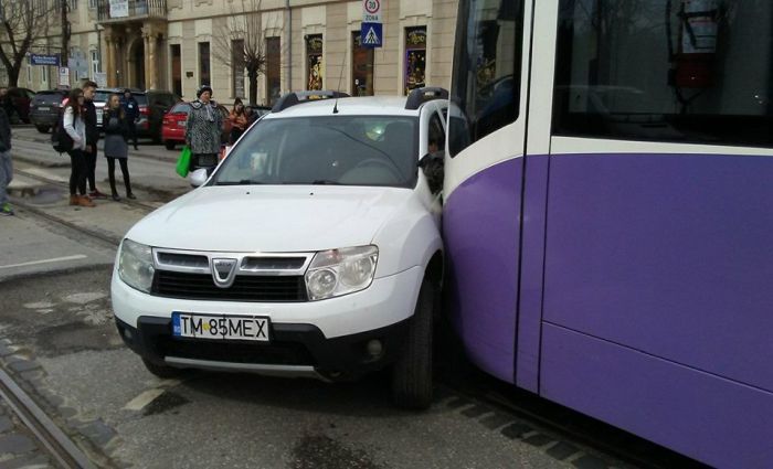 Un sofer aflat la volanul unui Duster nu a respectat indicatorul care interzicea virajul la stanga peste liniile de tramvai si a fost surprins de o Armonie care mergea spre Piata Libertatii, pe strada Proclamatia de la Timisoara.