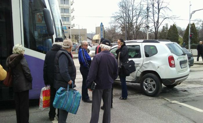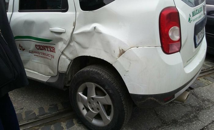 Tramvaiul nu a suferit avarii insemnate, insa Dusterul are portierele din stanga sifonate si oglinda praf.