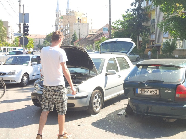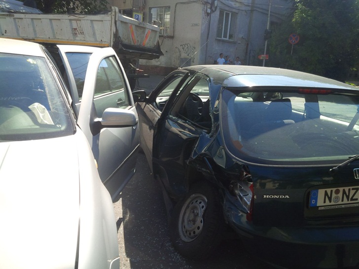 Acesta venea dinspre Piata Balcescu si mergea spre Brancoveanu. In intersectia de la Odobescu a decis brusc sa se intoarca spre centrul orasului si a facut “o romaneasca”, cum spun soferii. A tras de volan si a intors masina. Chiar in spatele sau venea un Golf in care se aflau doua femei si un copil. Soferita acestuia din urma, surprinsa de manevra neasteptata, n-a mai apucat sa franeze si a lovit Honda.