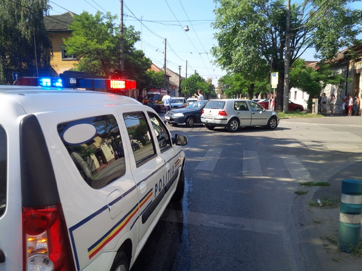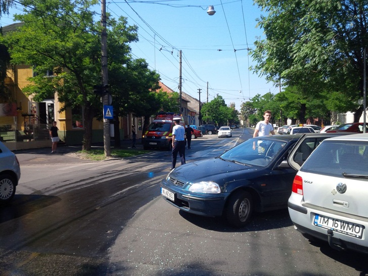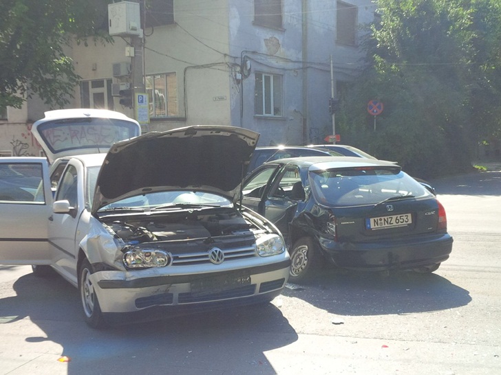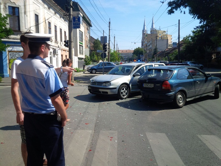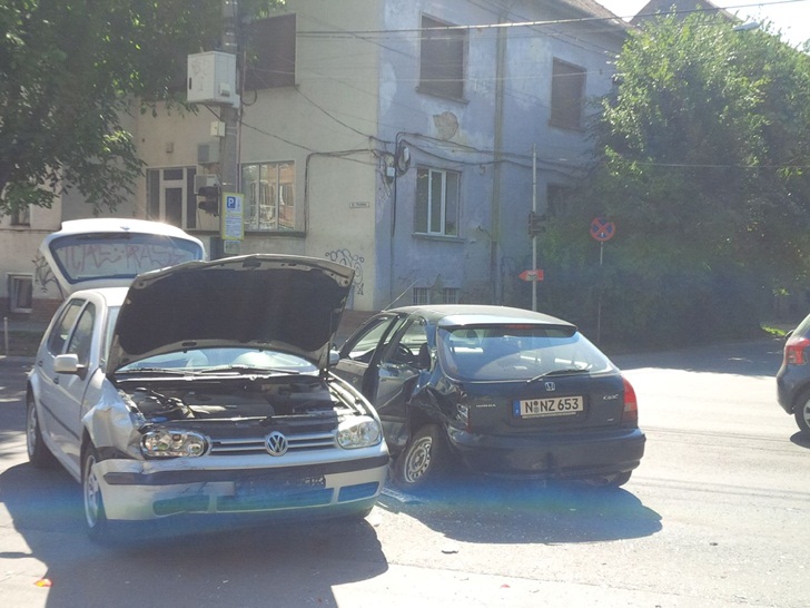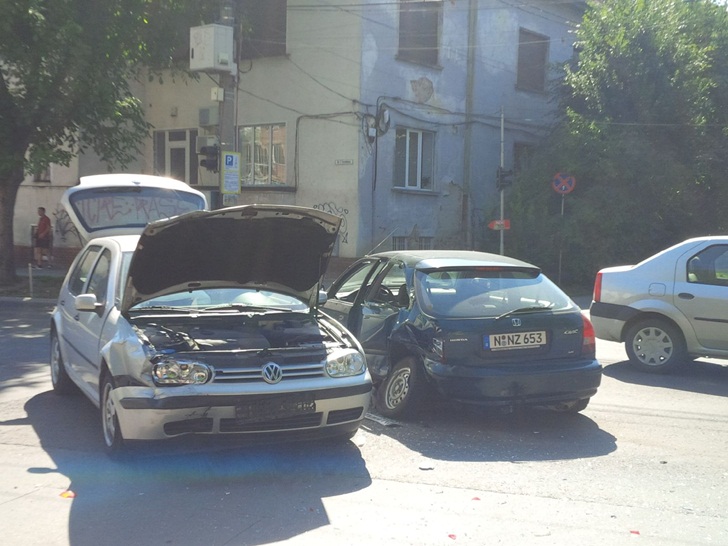 TIMISOARA. Ciocnire violenta la intersectia strazilor Porumbescu cu Odobescu, sambata dimineata, intre doua masini, o Honda si un Golf!