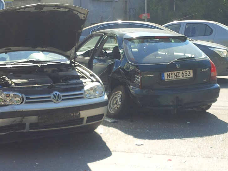 Impactul a fost destul de puternic, astfel ca ambele masini au ramas indoite si blocate in mijlocul intersectiei.