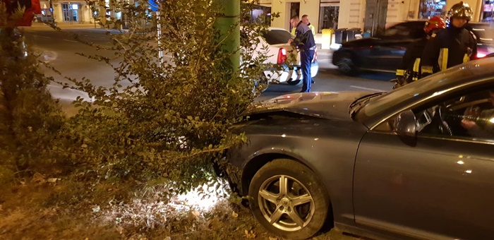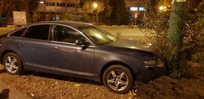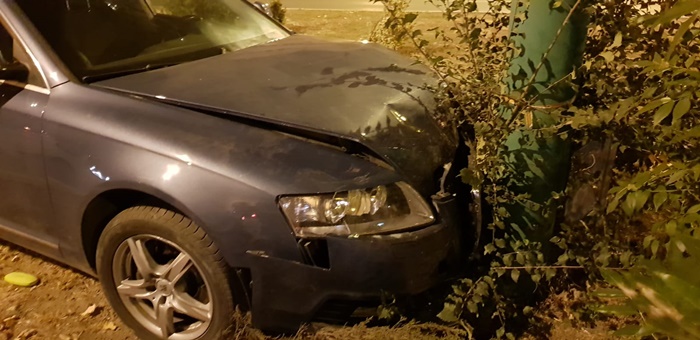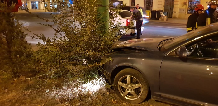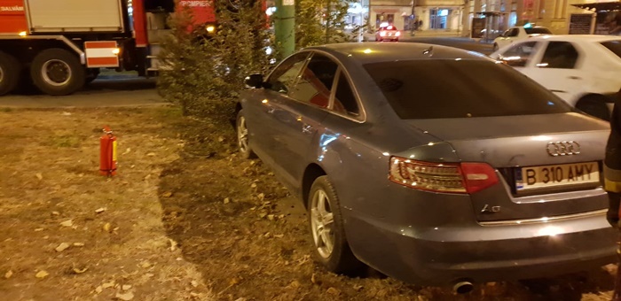 TIMISOARA. Accident in intersectia din Piata Balcescu la Timisoara. Soferul unui Audi a ratat o curba, a zburat de pe sosea pe spatiul verde si s-a izbit de un stalp de iluminat public.
