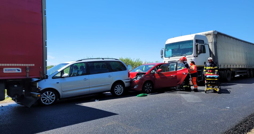 Cele doua masini au fost prinse intre vehiculele de mare tonaj, iar o femeie a fost ranita.