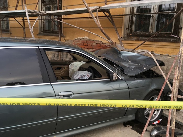 Evenimentul rutier s-a intamplat noaptea trecuta. Soferul unui BMW care venea dispre Primarie a intrat in sensul giratoriu si a vrut sa intoarca, insa a pierdut controlul volanului si s-a oprit cu masina in schelele puse pe langa cladirea Colegiului Miu.