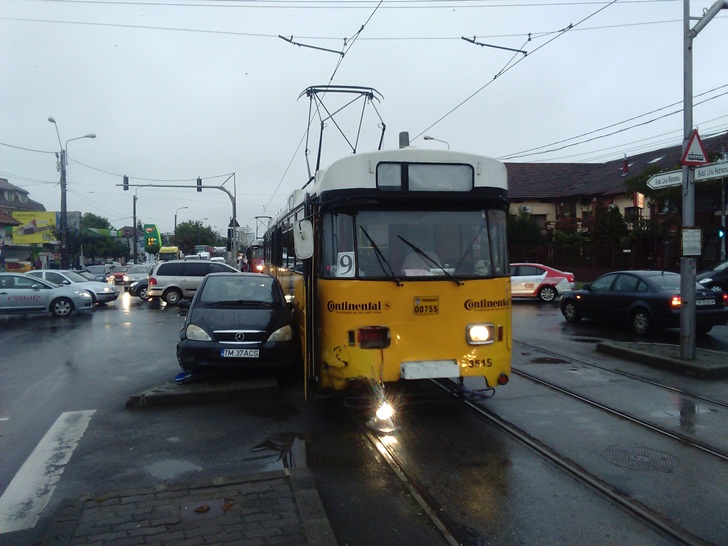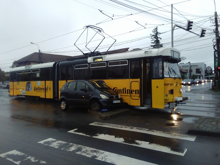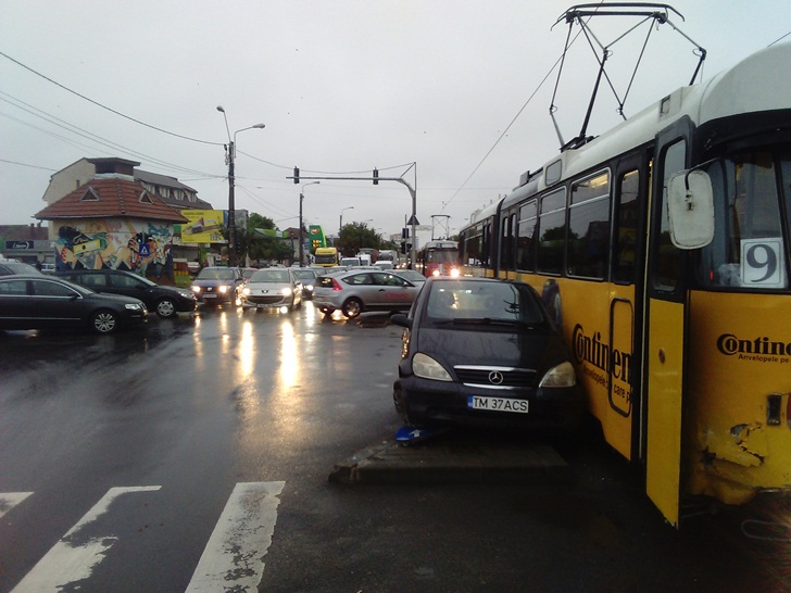 TIMISOARA. Trafic dat peste cap in aceasta dimineata pe bulevardul Liviu Rebreanu, la intersectia cu Brancoveanu. Un tramvai de pe linia 9, care se indrepta spre Spitalul Judetean, a izbit un Mercedes, dupa ce a patruns in intersectie pe culoarea rosie a semaforului.