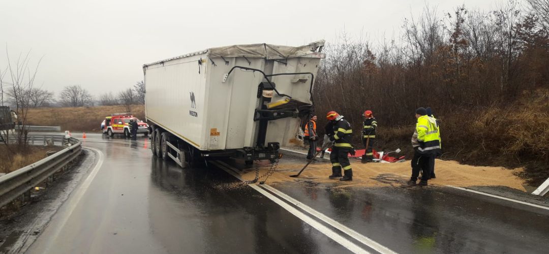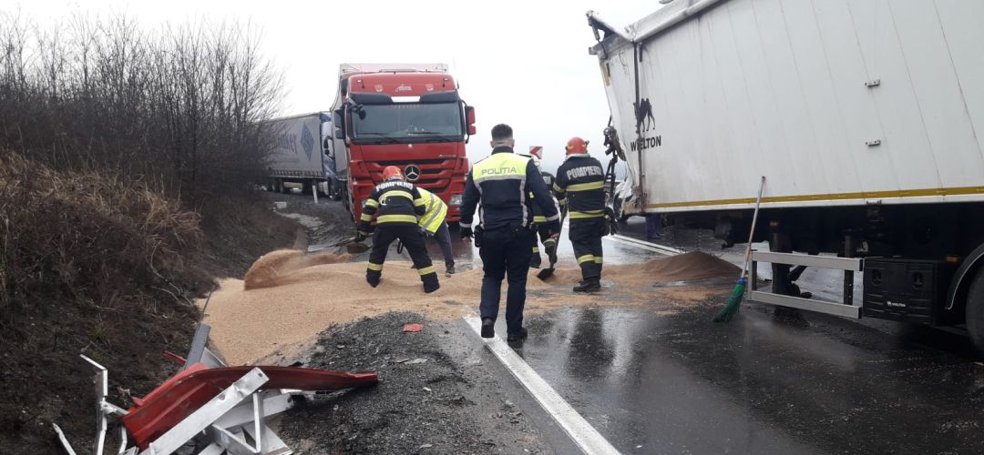 „Centrul INFOTRAFIC din Inspectoratul General al Politiei Romane informeaza ca pe DN 68A, intre localitatile Margina si Cosevita, judetul Timis, s-a desprins remorca de la un autocamion incarcat cu cereale si a colizionat un alt autocamion.