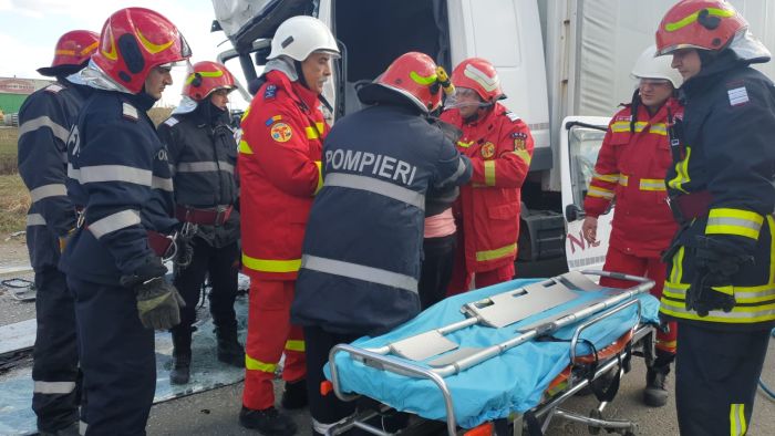 Doua camioane s-au ciocnit violent, astfel ca unul dintre soferi a ramas incarcerat in cabina zdrobita.