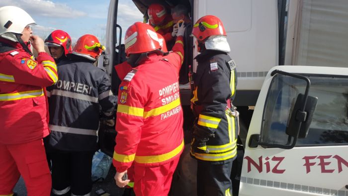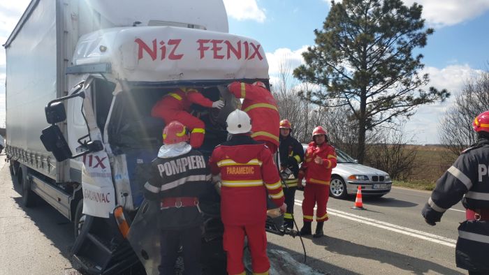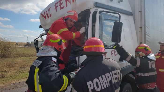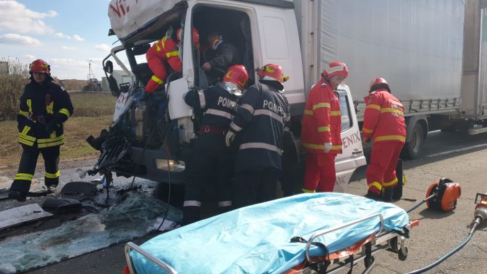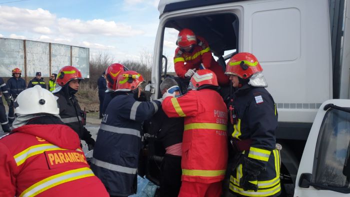 Doua camioane s-au ciocnit violent, astfel ca unul dintre soferi a ramas incarcerat in cabina zdrobita.
