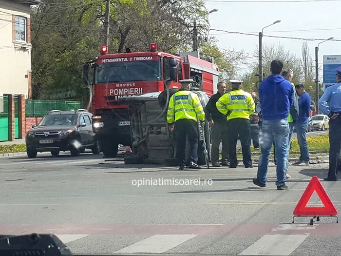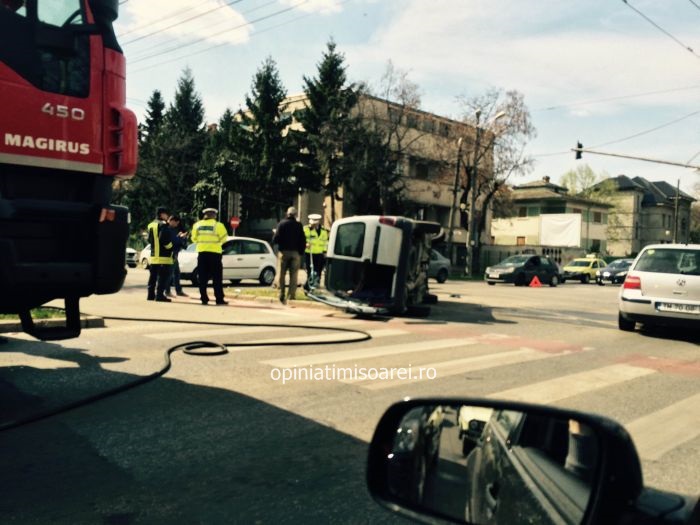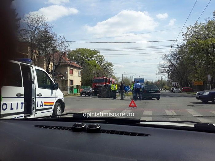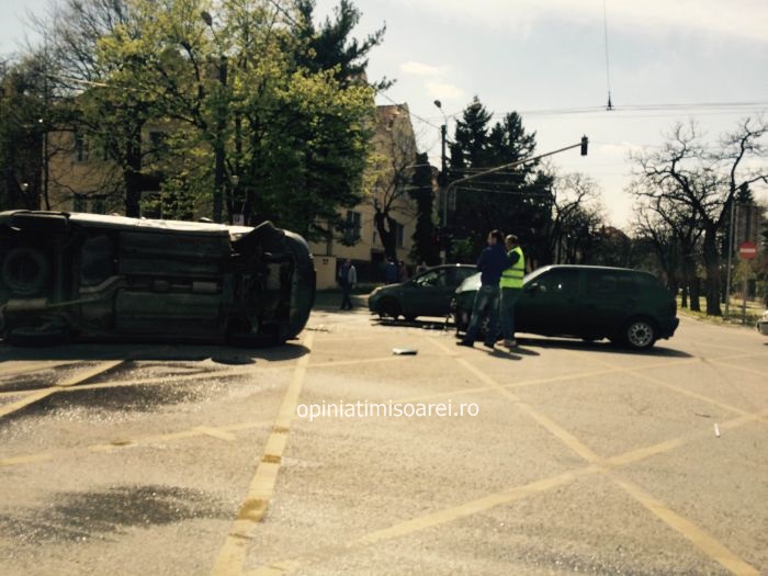 TIMISOARA. Accident la intersectia bulevardului C.D. Loga cu Michelangelo! O masina s-a rasturnat in mijlocul strazii, dupa ce s-a ciocnit violent cu un alt autoturism.