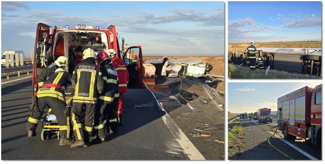 TIMIȘOARA. Grav accident de circulație pe Autostrada Vestului, vineri dimineață. Un tir și un microbuz, în care erau 8 oameni, s-au izbit violent.