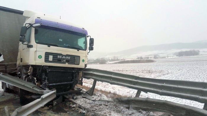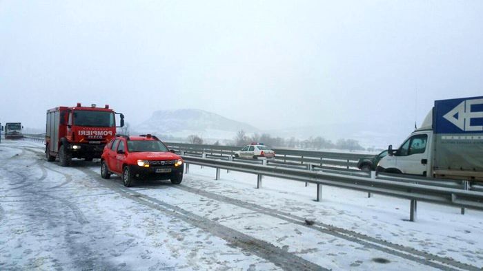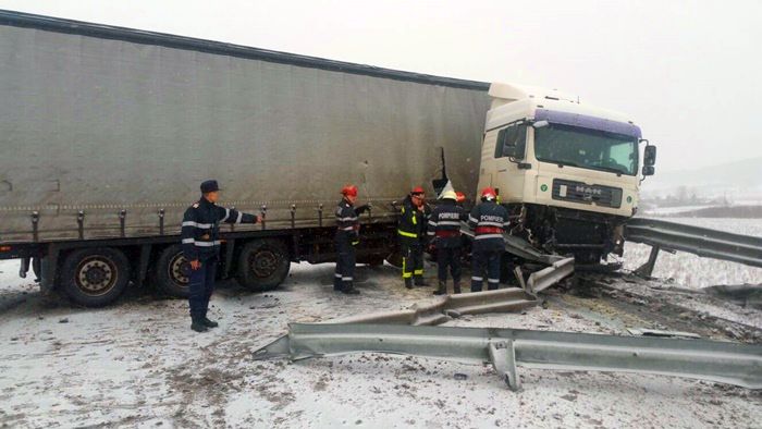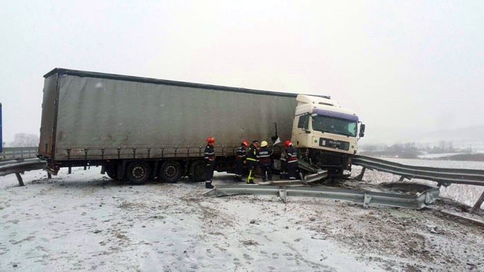 Accident marti dimineata pe A1 si circulatie blocata, dupa ce un autotren a derapat din pricina poleiului.