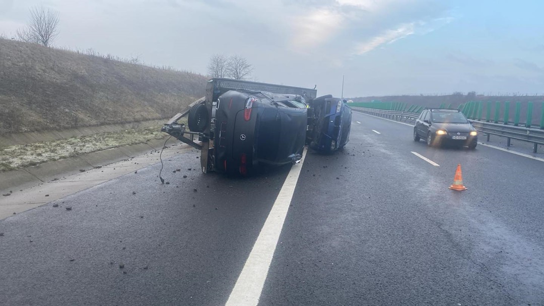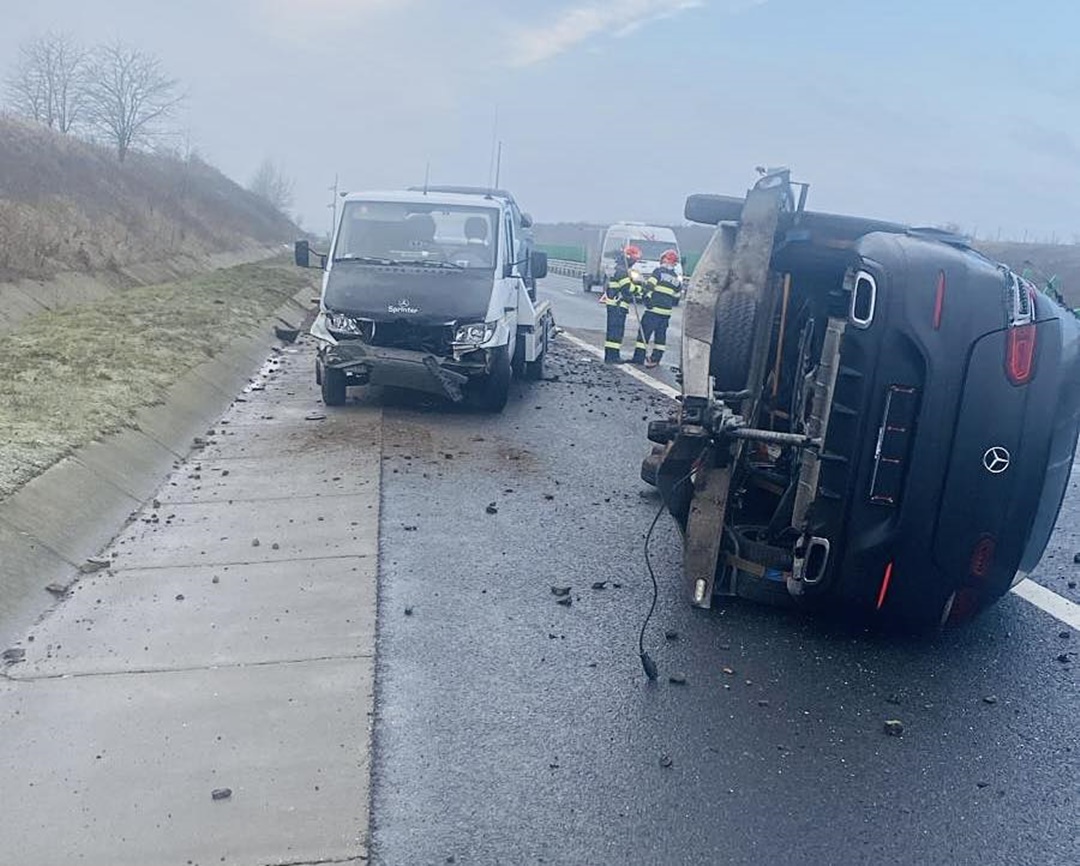 S-a dat alarma, sambata dimineata, dupa ce o autoutilitara care transporta masini s-a rasturnat pe Autostrada Vestului, intre Orastie si Sebes.