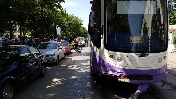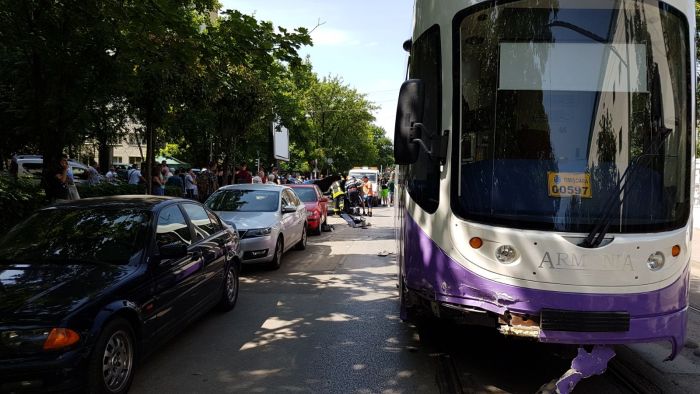 In tramvai era doar vatmanul, iar in autoturism numai soferul care a scapat doar cu traumatisme minore.