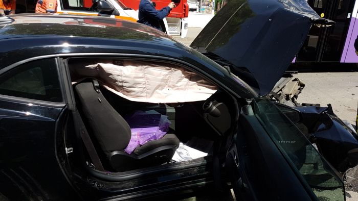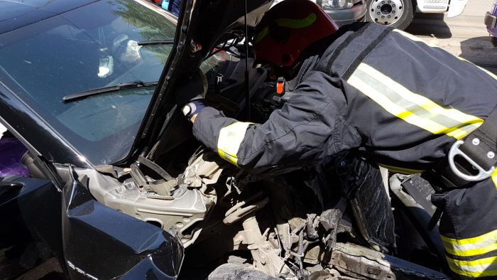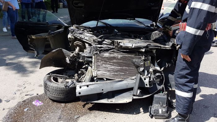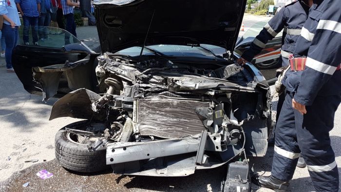 Nu e foarte clar cine a fortat culoarea rosie a semaforului, insa cert e ca masina a fost grav avariata, iar garnitura, o Armonie, a suferit doar ‘leziuni’ usoare.