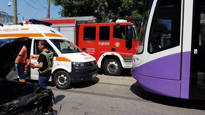 TIMISOARA. Impact violent intr-o intersectie din Timisoara la orele amiezii. Un autoturism a fost izbit de un tramvai Armonia.