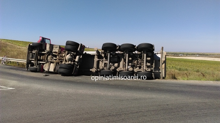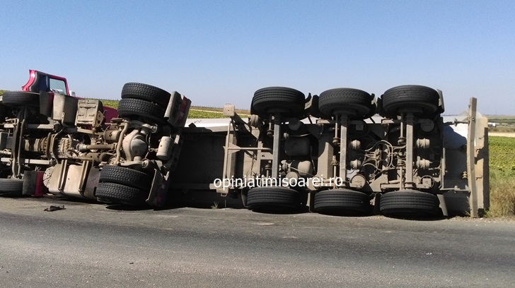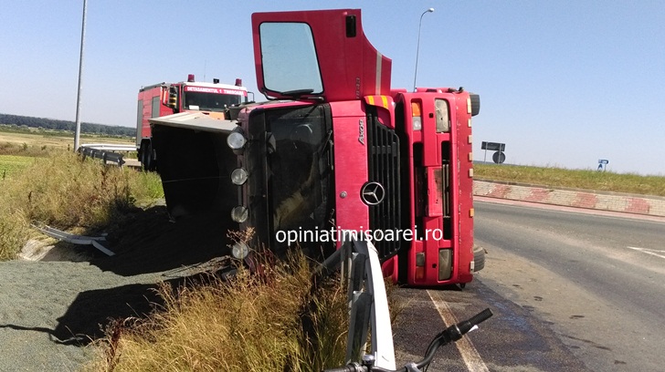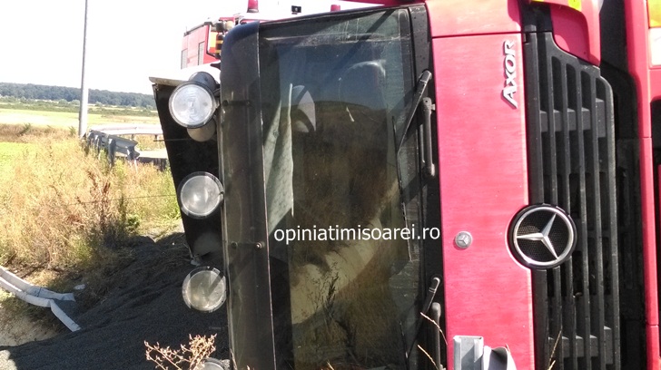 Masina a izbit in plin bordura, incarcatura a intrat in balans, iar camionul dezechilibrat s-a rasturnat pe partea dreapta.