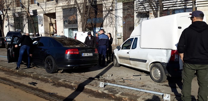 Audi-ul care a provocat accidentul s-a oprit complet intors pe bordura din dreptul liniei de tramvai.